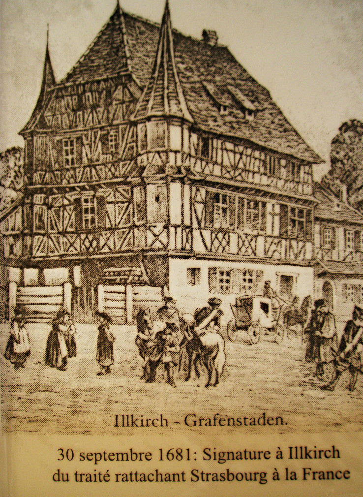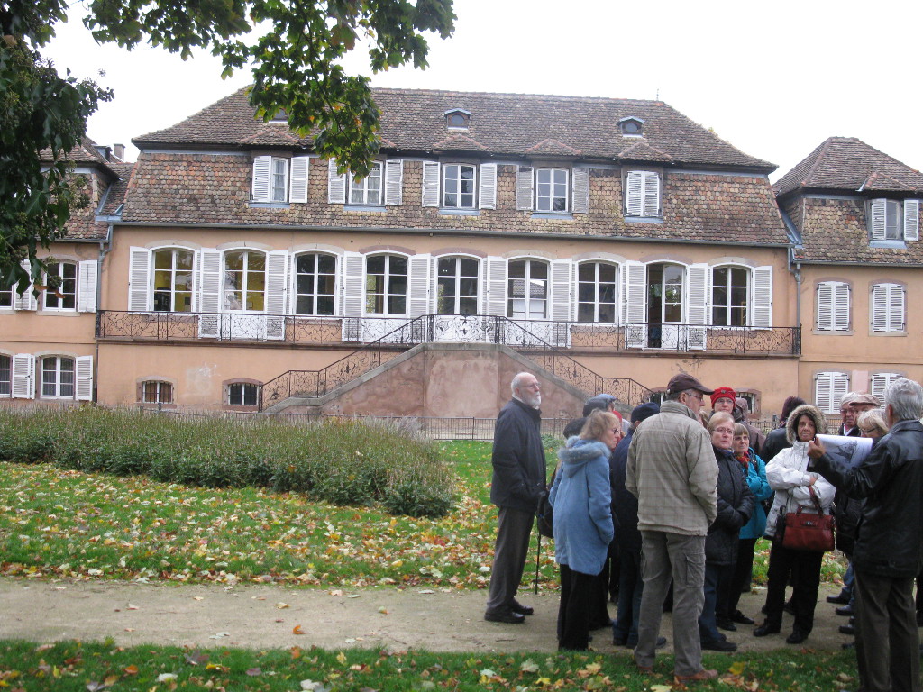 C'est qu'il en connaît un brin, le gars Jean-Marie, sur la ville qui l'a vu user ses fonds de culotte sur les bancs des écoles d'Illkirch... ou le dimanche après-midi sur les sièges du cinéma local. Avec la documentation qu'il a pu mettre sous nos yeux le parcours qu'il nous avait concocté a permis de nous plonger dans l'histoire, ancienne ou plus proche. On a pu ainsi situer entre autres les anciennes guiguettes au bord de l'eau, la maison commune où avait été signé en 1681 le rattachement de Strasbourg au Royaume de France, visiter le temple protestant témoin de la conversion des bourgeois d'Illkirch au protestantisme, le domaine Baumann (dirigeant avec son frère du moulin près de la Niederbourg, devenu plus tard "Illkircher Mullenwerke", maire d'Illkirch de 1914 à 1937); le château (dont il ne reste que l'Orangerie - photo ci-dessous) de ce peu recommandable Administrateur de la ville de Strasbourg, le dénommé François-Joseph Klinglin : il avait après 1725 quelque peu confondu les finances publiques et les siennes propres... quelque chose d'abolument inimaginable de nos jours ! |
