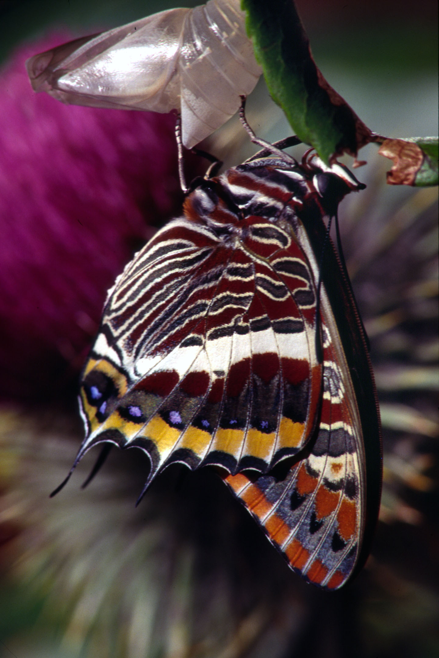 Nous avons ainsi pu suivre, pas à pas, le cycle d’un papillon « aurore » depuis l’œuf, l’éclosion de la chenille qui ensuite se fixe à une branche d’arbre pour se faire chrysalide, avant de donner naissance l’an d’après et en une dizaine de minutes, à un magnifique papillon aux ailes couvertes d’écailles. Tel est l’aboutissement d’un processus, qui dure une année et compte quatre métamorphoses complètes pour aboutir à une vie éphémère d’une quinzaine de jours !